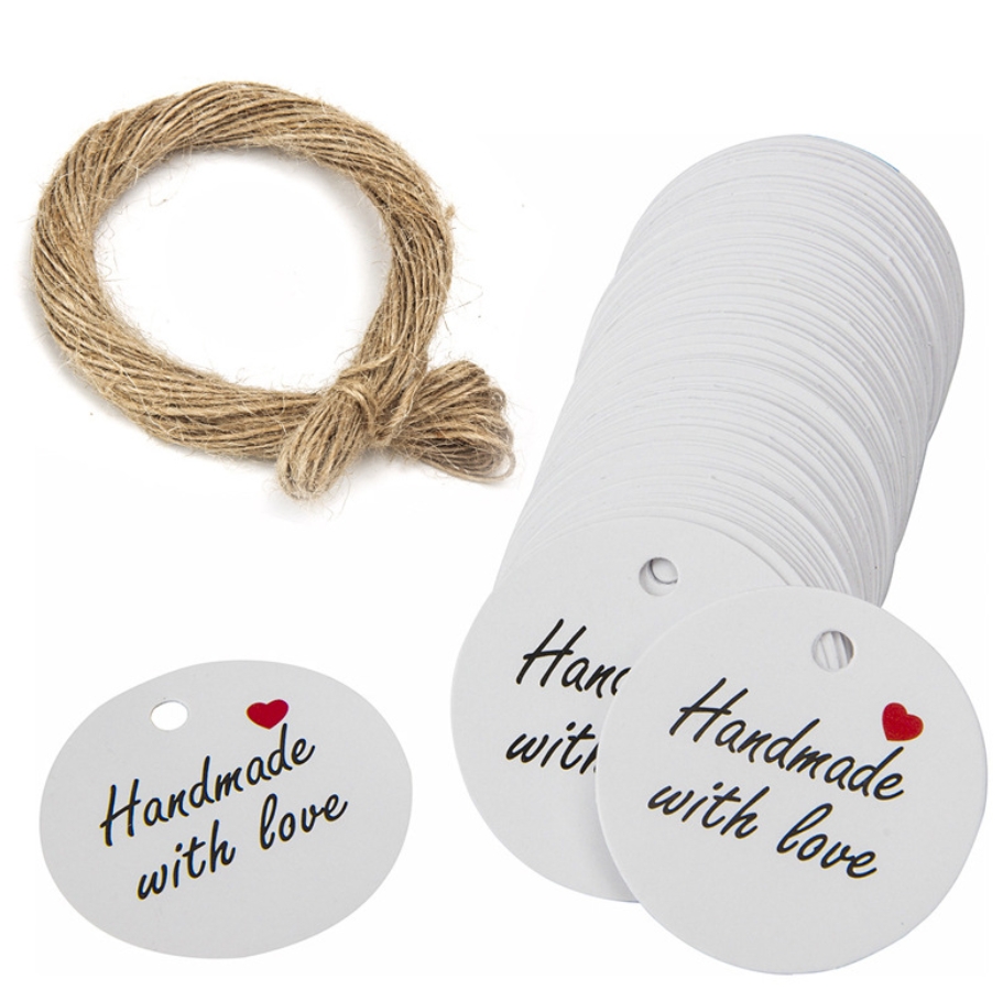 Sada 10 papírových přívěsků ve tvaru kruhu s nápisem 'With Love'. Každý přívěsek má průměr přibližně 30 mm a je vybaven průvlekem o průměru 3 mm. Součástí je přírodní provázek.