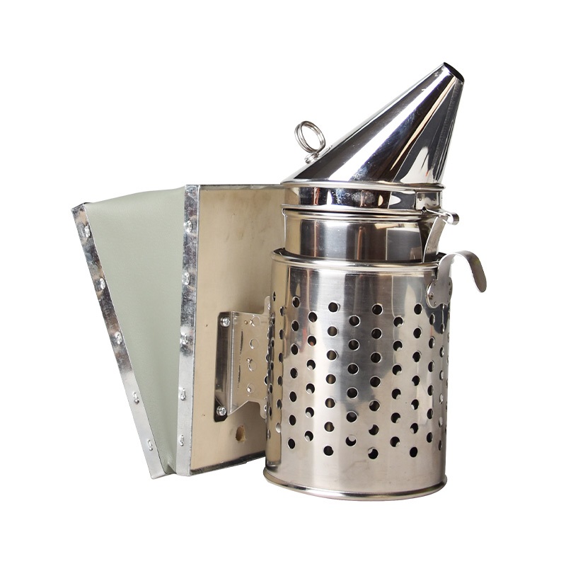 Nerezový dýmák slouží ke zklidnění včel při práci v úlu – dým odvádí jejich pozornost a snižuje agresivitu.